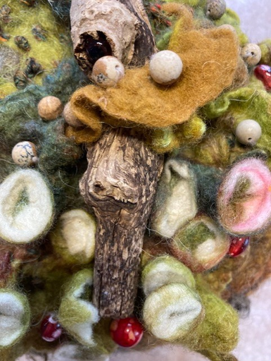 Als basis gebruik ik meestal wol, waar ik tijdens het vilten diverse materialen aan toevoeg, zoals papier, zijde en andere vezels. Mijn werken zijn niet compleet zonder diverse decoraties. Gedroogd hout, (hergebruikte) kralen, zelfgesponnen draden en borduursteekjes vormen de afwerking.