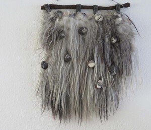 2020Een klein wandkleed in bruintinten gemaakt van ruwe wol met korte franje, een dunne wortelstok, houten kralen en goudkleurig borduursel. De wortelstok staat symbool voor het leven en de verschillende wegen die je tijdens je leven bewandelt. De kralen symboliseren het aantal verschillende contacten tijdens de verschillende episodes in je leven en de hoeveelheid gouden steekjes geven de invloed aan die deze contacten op je eigen leven hebben of hebben gehad. 100% natuurproduct. Milieuvriendelijk.